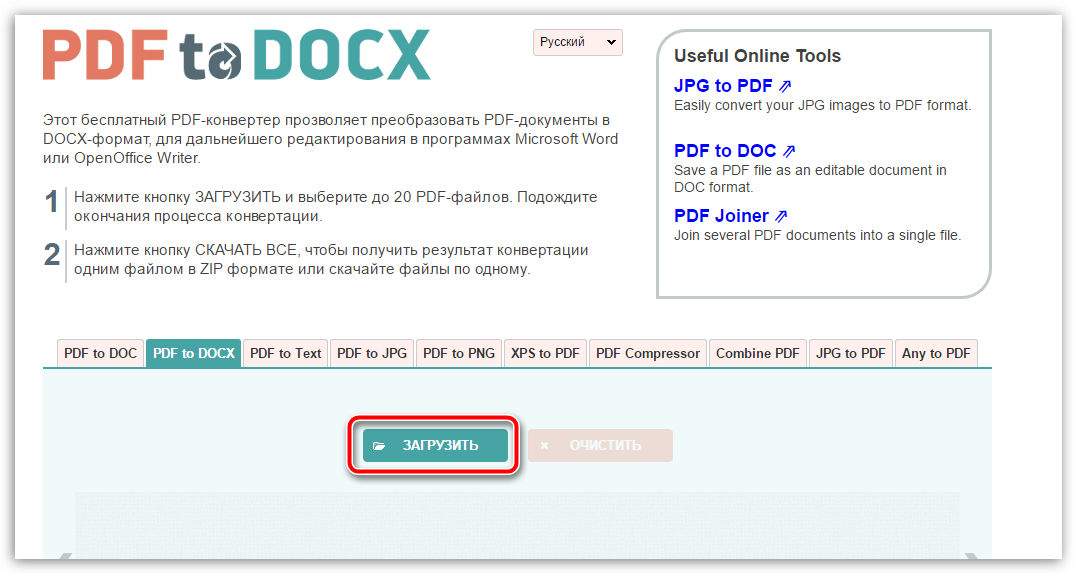 На ваш компьютер будет загружен ZIP-архив, который для дальнейшей нашей работы потребуется распаковать. Теперь пройдите на страницу того же сервиса (ссылка ниже), который позволит перевести PDF в Docx. Точно таким же образом щелкните по кнопке «Загрузить», а затем укажите PDF-файл.