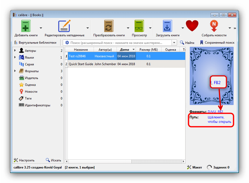 Когда конвертирование закончится, снова выделите нужную книгу. В столбце свойств, расположенном справа, вы увидите, что рядом с форматом «DJVU» появился «FB2». Нажатие на название расширения откроет книгу названного типа. Чтобы открыть папку, где хранится полученный FB2-файл, нажмите на соответствующую ссылку в свойствах.