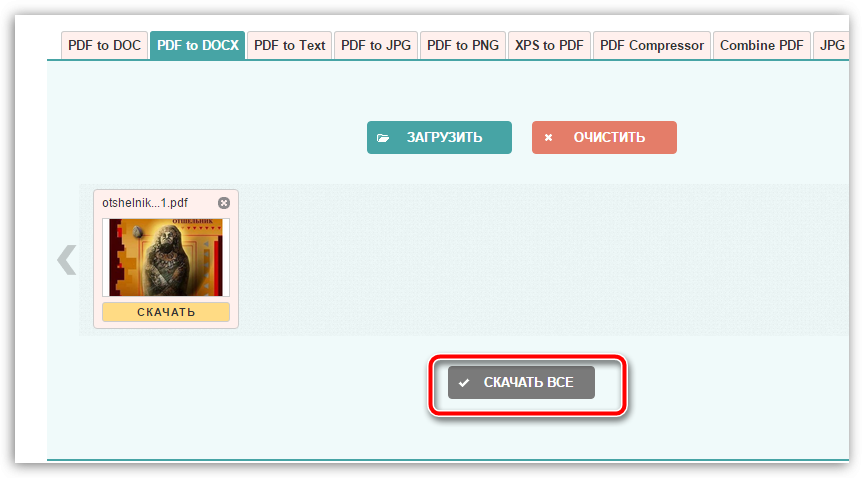 Сервис сразу начнет обработку загруженного файла. Как только обработка будет завершена, вам будет предложено загрузить результат на компьютер щелчком по кнопке «Скачать все».