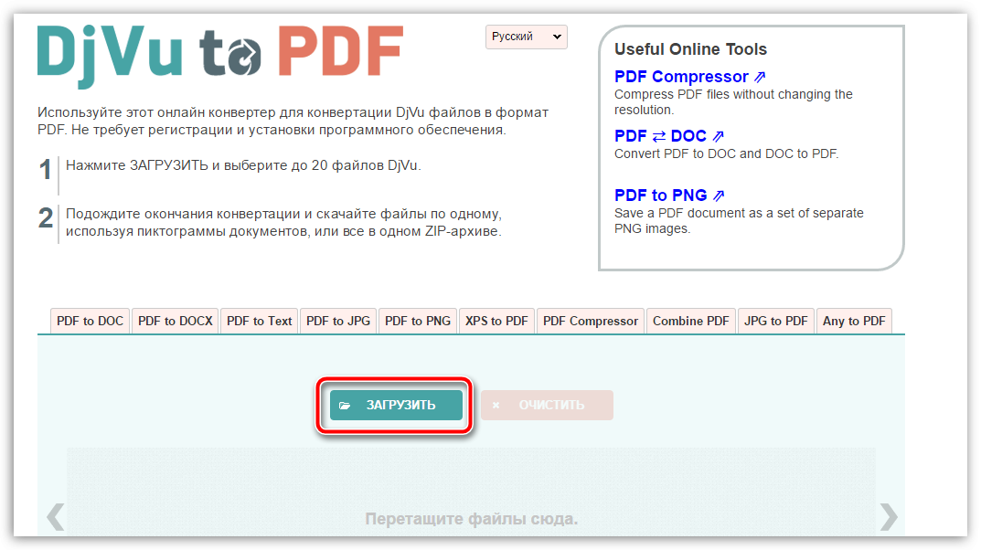 Для начала пройдите на страницу сервиса DjVu to PDF по этой ссылке и щелкните по кнопке «Загрузить». На экране отобразится проводник Windows, в котором вам потребуется выбрать исходный DjVu-файл.