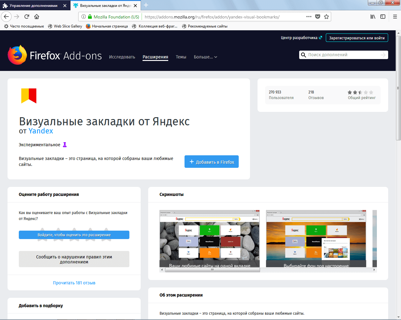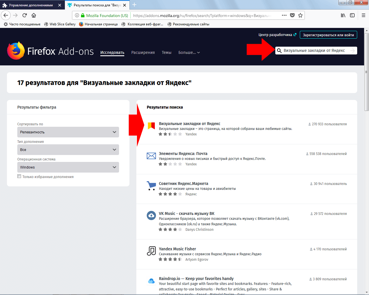 Клик по этой синей кнопке откроет нужный нам маркет дополнительных приложений для Mozilla. В форме поиска пропишите: «Визуальные закладки от Яндекс»