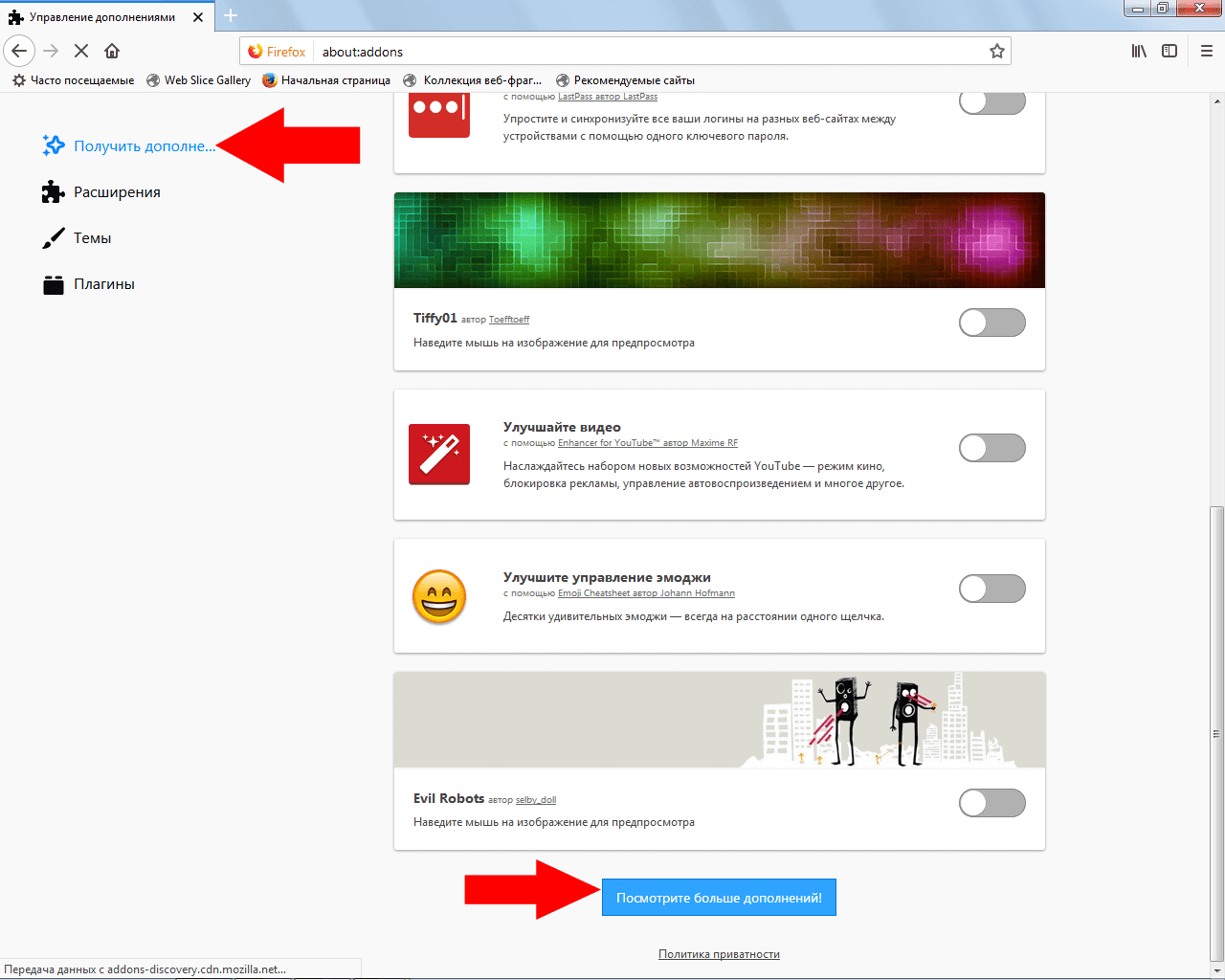 пролистайте вниз. И когда увидите кнопку «Посмотреть большей дополнений!»