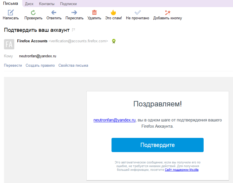 Войдите на свою почту и найдите там письмо от FireFox Account с темой “Подтвердите ваш адрес электронной почты …” или аналогичной. В письме нажмите “Подтвердить почту”.