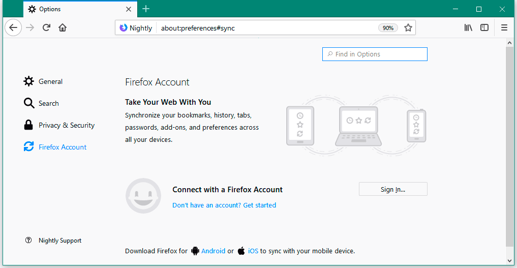 Допустим, Вы прошли все шаги по созданию учётной записи в Firefox Sync и теперь у Вас возникла необходимость синхронизировать все настройки вашего браузера на другом устройстве. Приведенные ниже скриншоты показывают процесс входа в Firefox Sync на компьютере под управлением Windows 10, но те же самые шаги применяются для Firefox на Windows 7, 8, Apple OS X, Android и Linux.