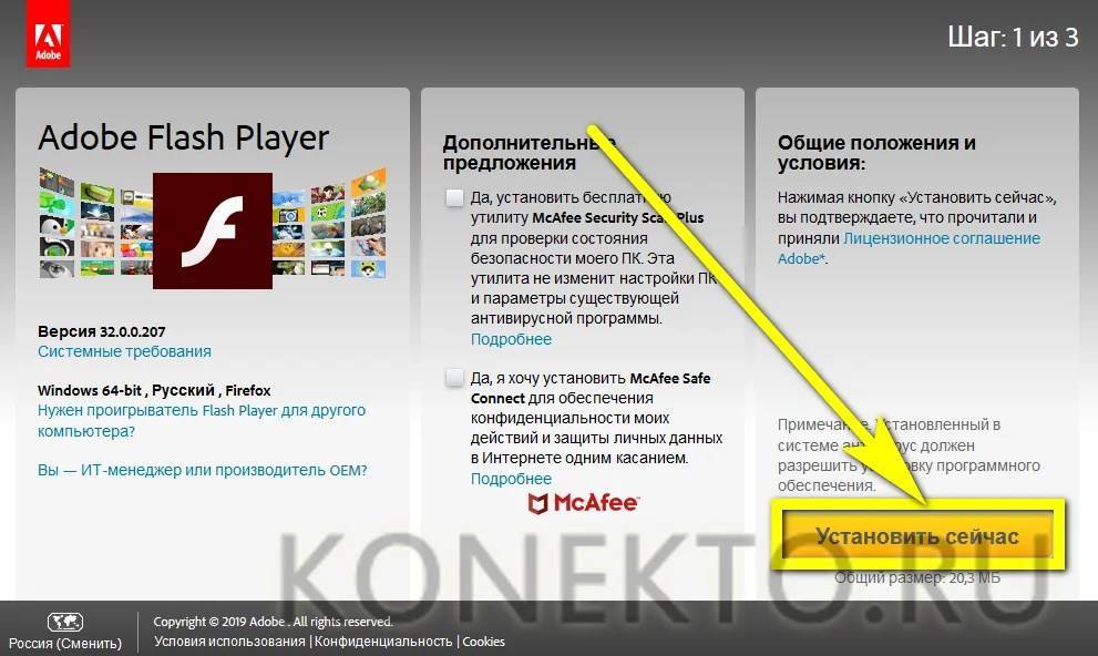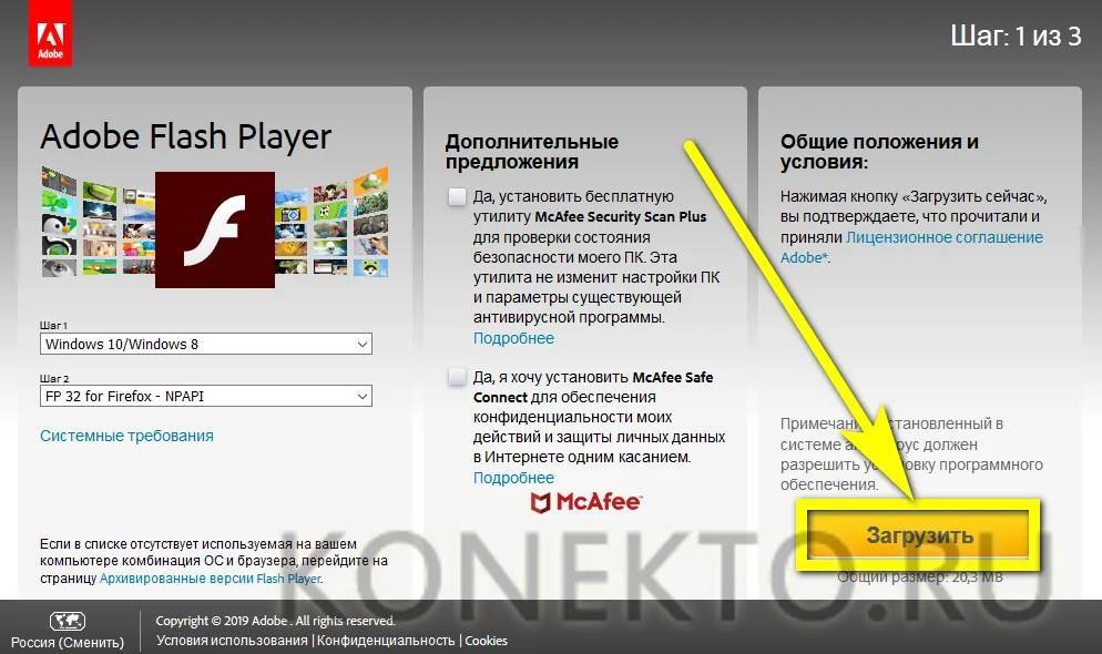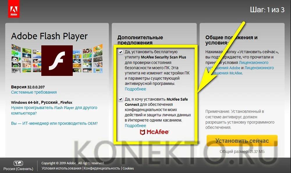 Обратите внимание на самый центр окна, где вам по умолчанию будет предложено загрузить и инсталлировать на компьютер дополнительное ПО (в нашем случае это антивирусная утилита McAfee). Если вы не хотите загружать его на компьютер, вам потребуется обязательно снять галочки