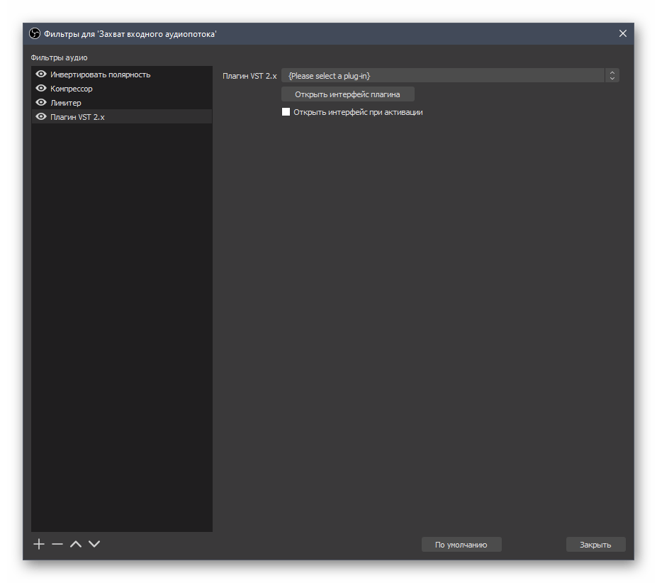 Этот фильтр пригодится тем, кто скачал плагины, находящиеся в свободном доступе, или приобрел их на официальных сайтах. OBS поддерживает огромное количество различных плагинов для настройки звука и разнообразных эффектов, которые часто применяют опытные пользователи. Как раз через фильтр «Плагин VST 2.x» и производится выбор подходящего инструмента.