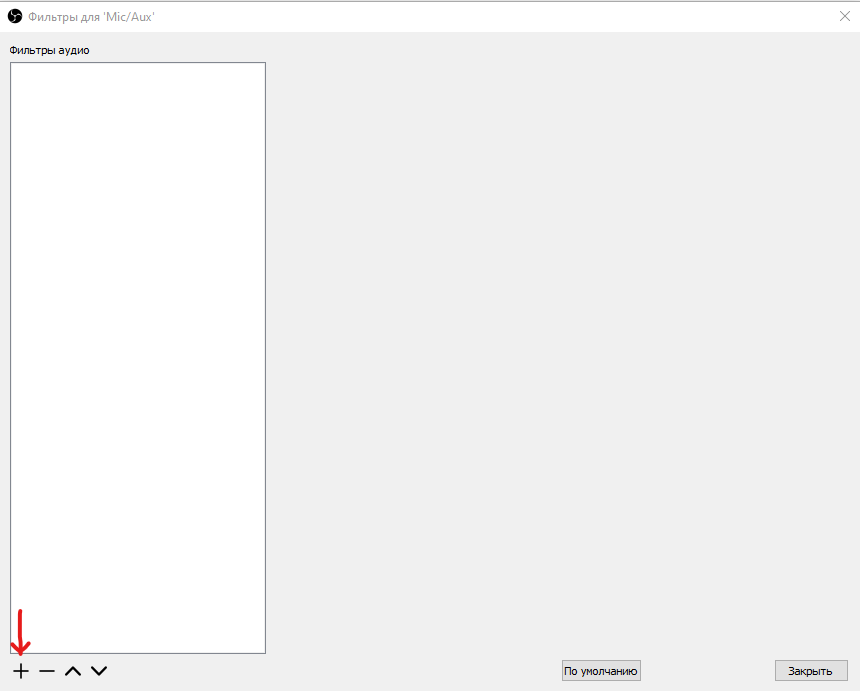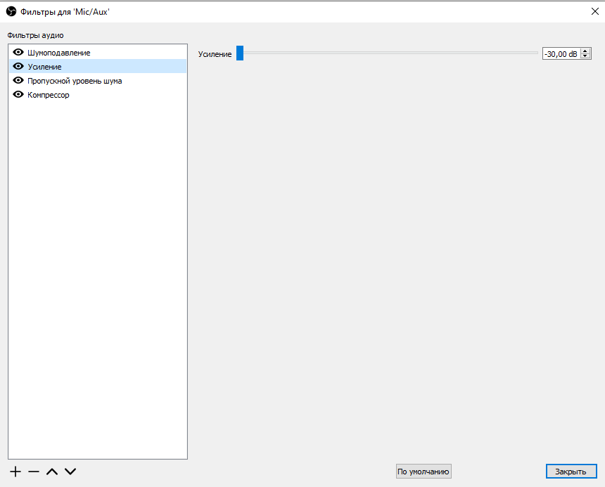 Осталось разобраться с основным процессом настройки микрофона при помощи встроенных в OBS фильтров. Каждый из них имеет свой набор параметров, поэтому рассмотрим предназначение фильтров более детально, а пока покажем, как перейти в меню для их добавления.