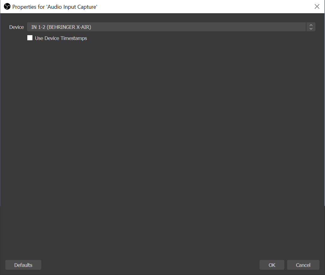 В OBS при добавлении источника нужно выбрать IN 1-2(BEHRINGER X-AIR)