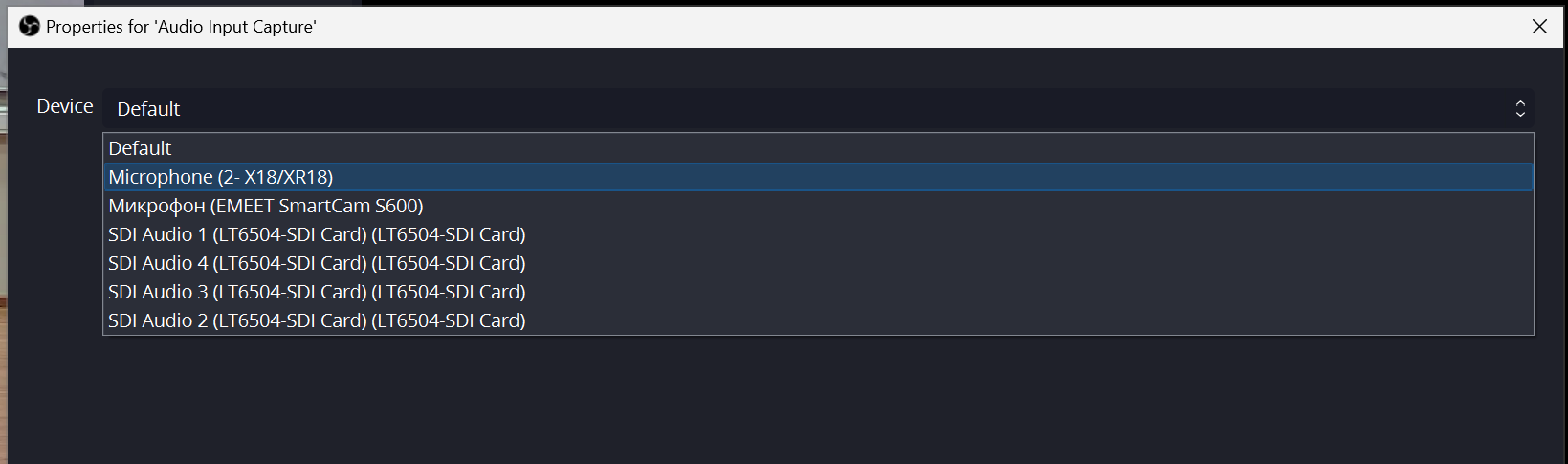 В появившемся окне разворачиваем выпадающий список и выбираем нужный источник. В случае сет-апа медиацентра (505 аудитория) необходимо выбрать источник XR18.