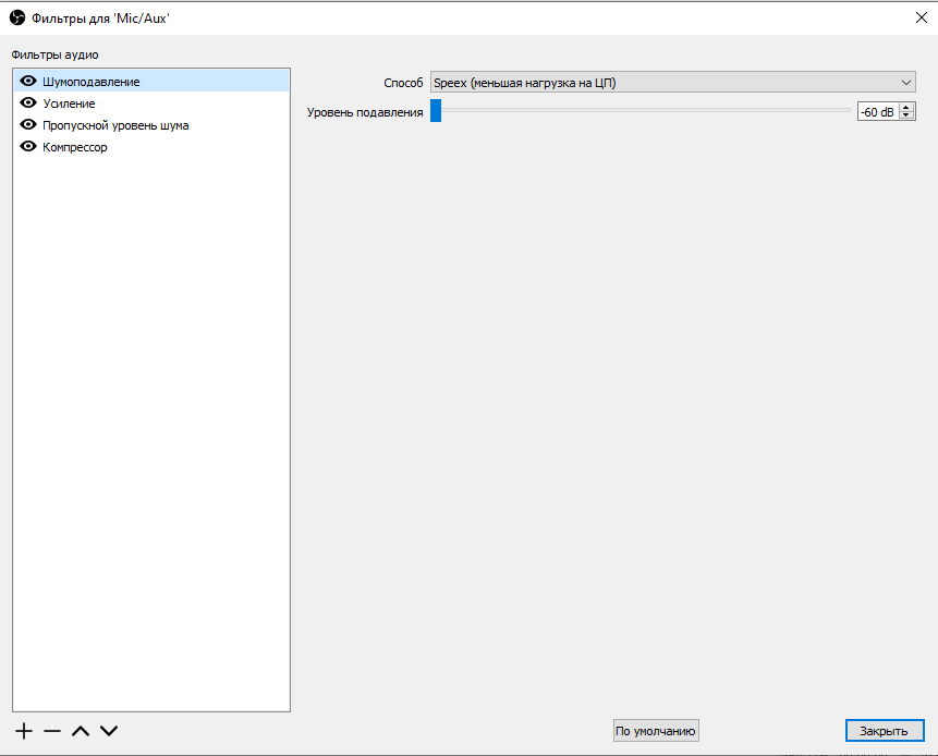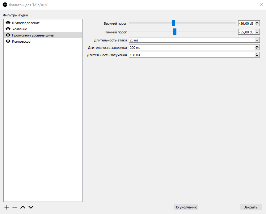Эти два плагина применяются чаще всего, поскольку не каждый стример или желающий записать видео с экрана использует профессиональный микрофон, который полностью отсекает внешние шумы и не добавляет их программно из-за специфики работы. Каждый из этих фильтров настраивается по-разному, а об их работе мы уже говорили в другой статье на нашем сайте.