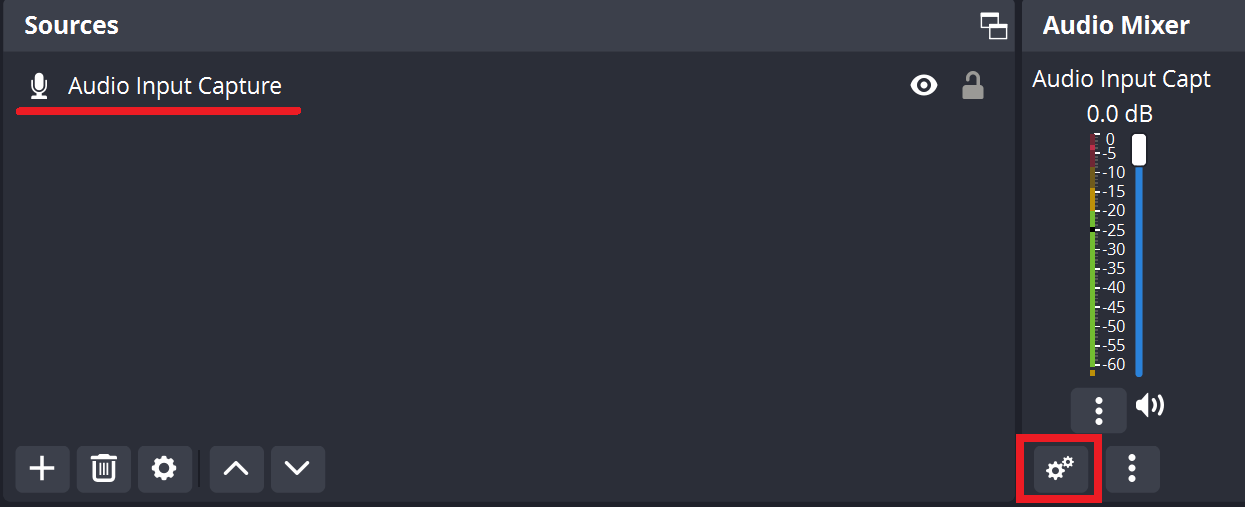 После выбора аудио-источника он появляется в окне Sources справа от окна Scenes. Ещё правее в окне Audio mixer появляется звуковая шкала, имеющая то же имя, что и у источника. После этого необходимо нажать на шестерёнку (выделена красным цветом) для дальнейшей настройки.
