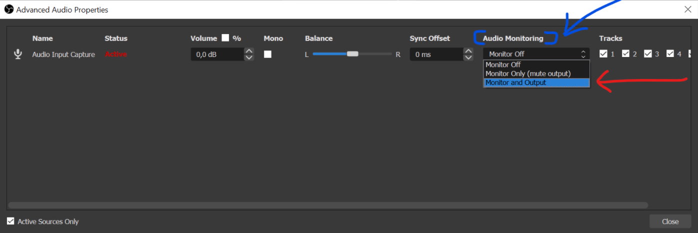 Вам откроется окно настройки. В нём необходимо открыть выпадающий список под названием Audio Monitoring (выделено синим цветом), и уже в нём выбрать опцию Monitor and Output (выделено красным цветом)