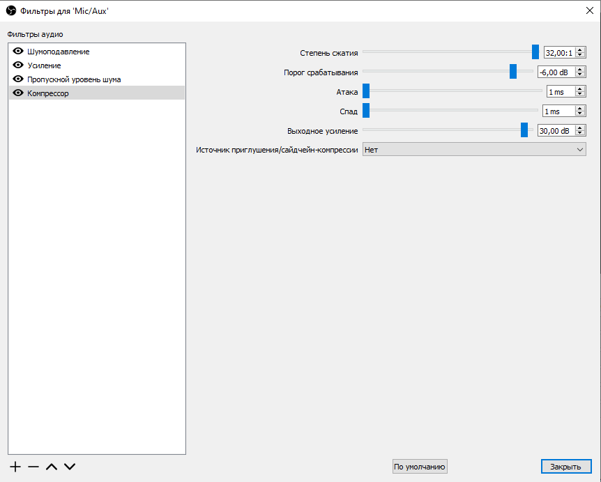 Фильтр автоматически снижает громкость поступающих звуков, чтобы не допускать уровня шума выше 0 дБ. Как только громкость снизится до нормального уровня, компрессор перестанет стабилизировать звук. Проще говоря, этот фильтр делает громкие звуки тише. Во всей готовой цепочке фильтров он обычно ставится первым или поближе к началу.