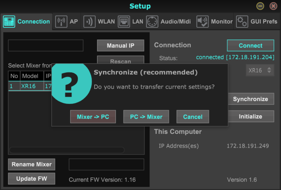 Для начала заходим в программу X AIR EDIT, в настройках нужно нажать кнопку Connect, после этого Mixer -> PC.