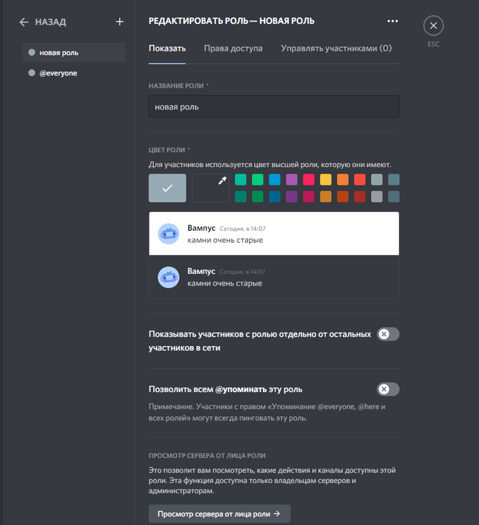 - Введите имя роли и выберите ее цвет, чтобы легко отличать ее от других.