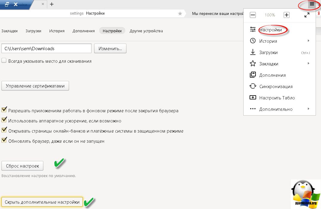 Ну и напоследок посмотрим как производится сброс настроек браузера от поискового гиганта рунета, компании Яндекс. Так же открываем их yandex браузер, справа вверху значок меню > Настройки и далее в открывшемся окне Дополнительно, спускаемся в самый низ и находим кнопку Сброс.
