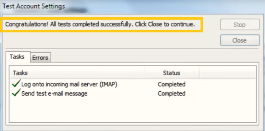 После настройки произошла настройка IMAP. Вы увидите сообщение об успешном завершении.