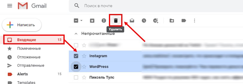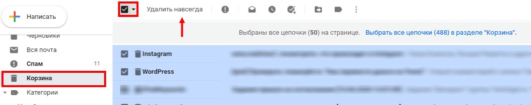 Почта Gmail. Открываем “Входящие”, отмечаем ненужные письма и жмем на “Удалить”. Далее переходим к папке “Корзина”, там выделяем сразу все письма (флажок вверху слева) и жмем на “Удалить навсегда” (рядом с флажком).