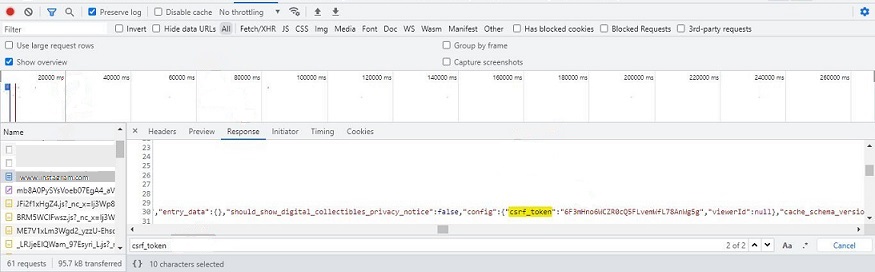Обновите страницу и слева в «Name» найдите www.instagram.com, нажмите. Правее во вкладке «Response» в коде найдите «csrf_token» (можно воспользоваться поиском). Скопируйте текст между «:» и запятой.