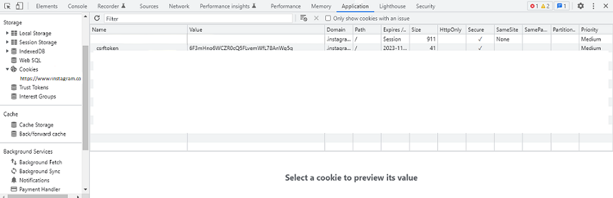 Теперь в DevTools открываем вкладку «Application» и слева в «Storage» > «Cookies» выбираем instagram.com. В открывшемся справа блоке нажимаем на пустую строку внизу, в поле «Name» вводим «csrftoken», а в «Value» – скопированный текст. Ставим галочку в «Secure».