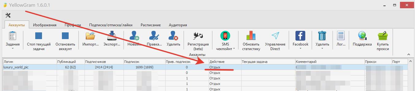 После первого нажатия «Обновить статистику» в YellowGram может появится статус «Заблокирован/удален». Снова нажмите «Стоп текущей задачи» и «Остановить аккаунт» и при необходимости установите чекбокс Аккаунт: «активен» в настройках аккаунта.
