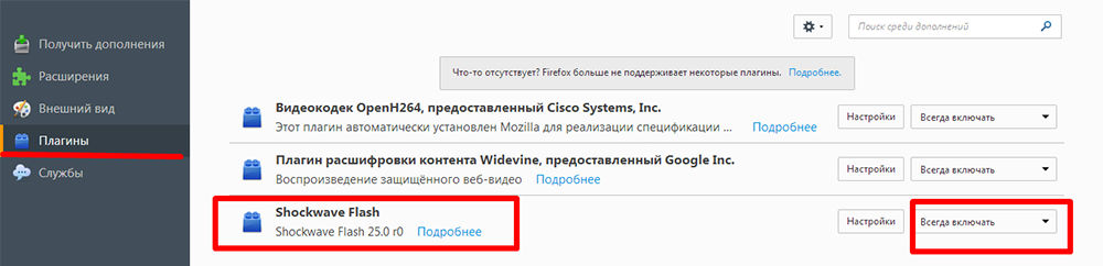 - Теперь кликните на «Дополнения» – «Shockwave Flash» – «Всегда включать».