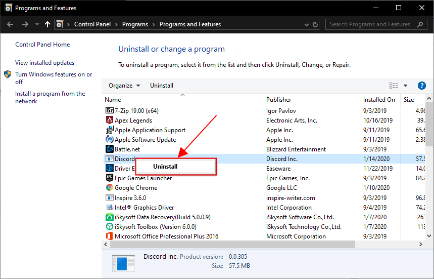 6) Найдите Discord, затем щелкните его правой кнопкой мыши и выберите Удалить .