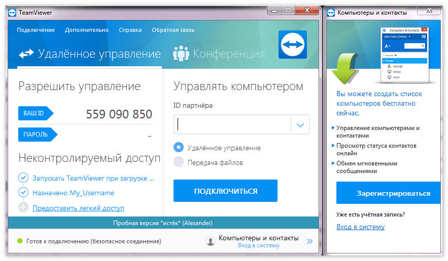 После установки программы укажите свой ID и пароль. После этого вы сможете удалённо управлять своим компьютером. Чтобы удалённо подключиться к партнеру, введите ID партнера в соответствующем поле.