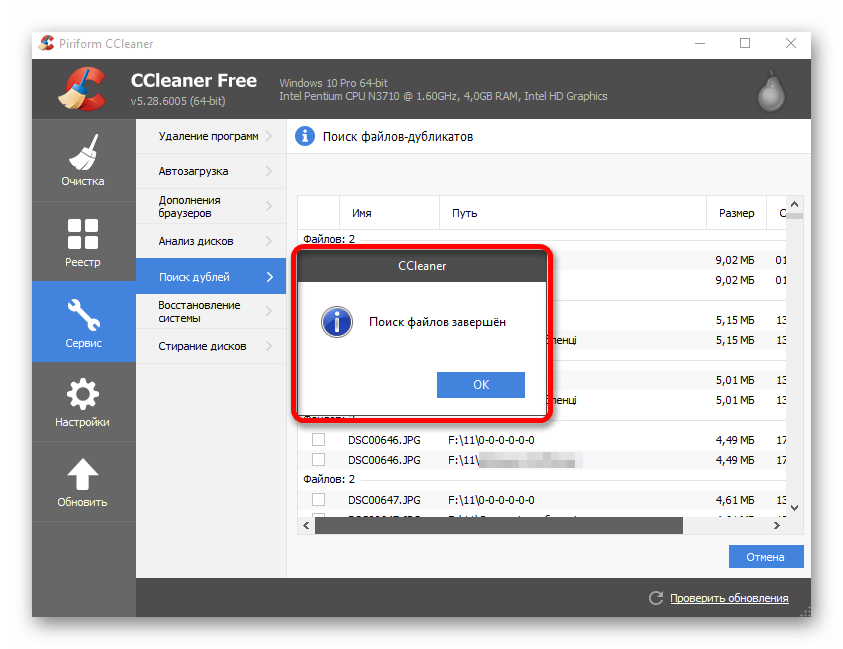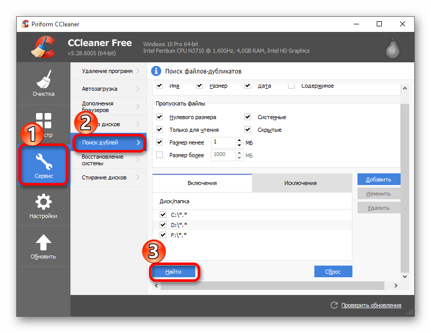 - В программе Ccleaner перейдите во вкладку «Сервис», а потом в «Поиск дублей». Вы можете настроить нужные вам параметры.