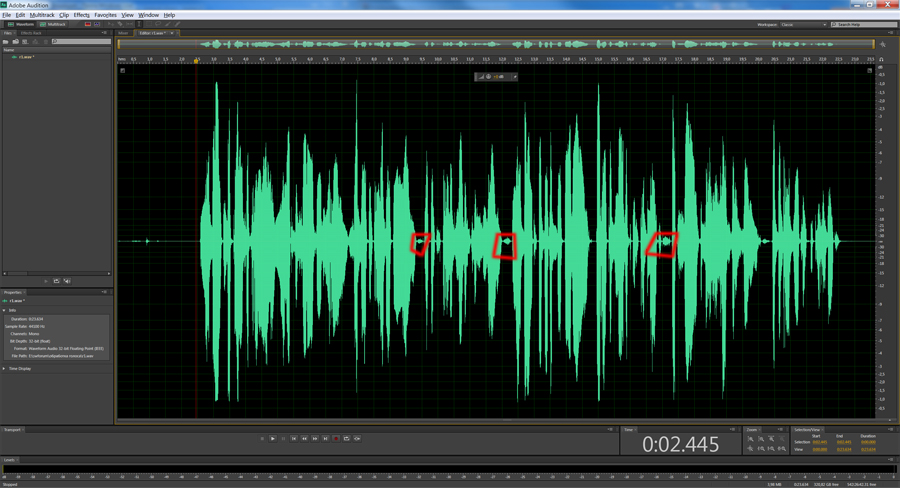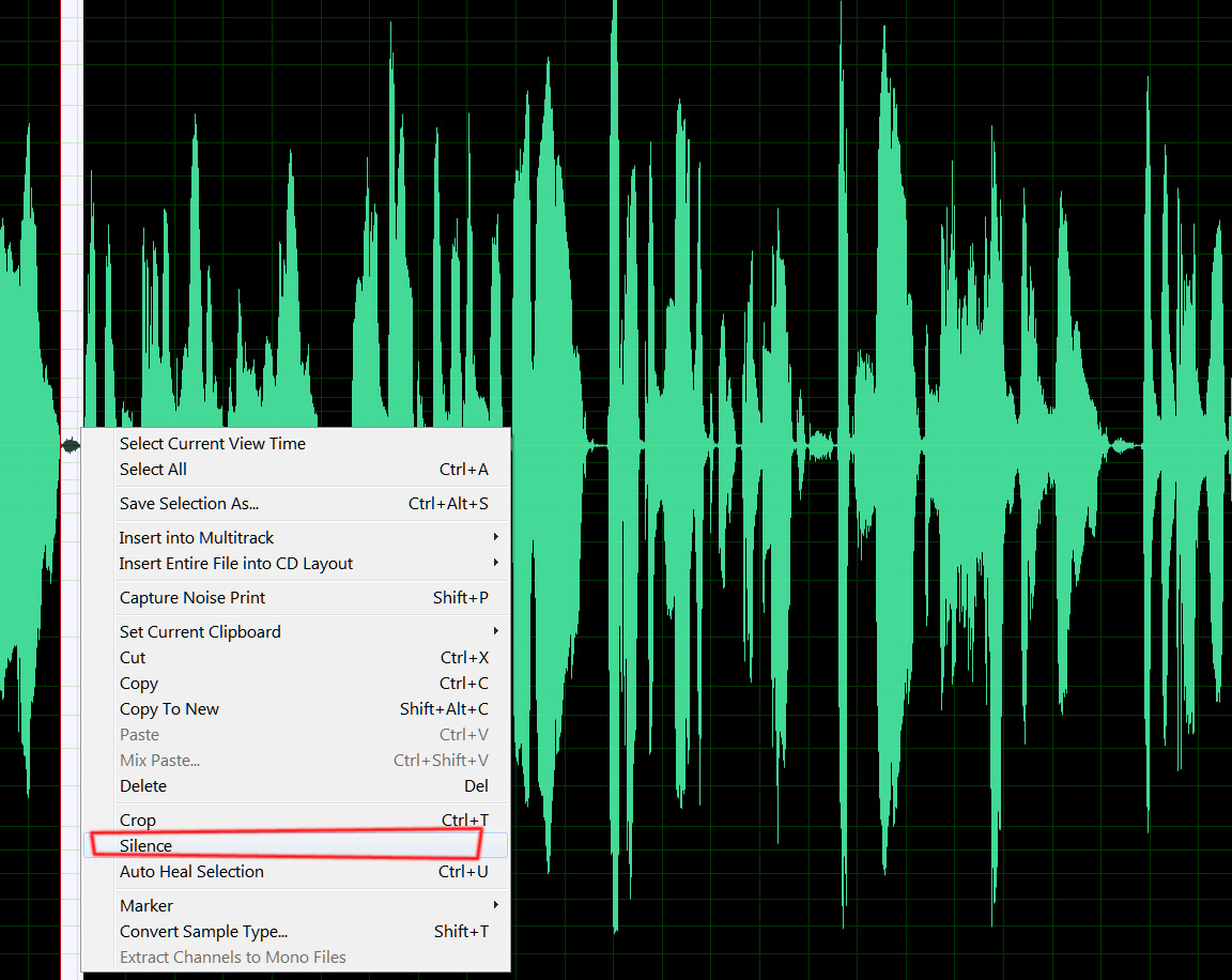 Обратите внимание, на выделенные красным цветом участки — это ненужные нам участки, на которые не подействовало шумоподавление, так как это запись дыхания. Избавимся от них вручную. Для этого выделим каждый из этих кусочков, щелкнем правой клавишей мыши и выберем пункт Silence