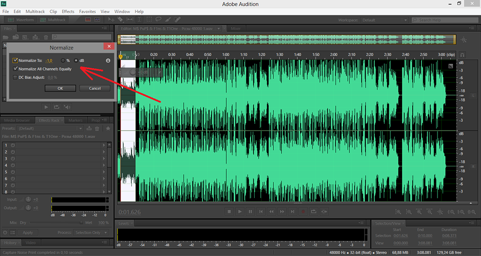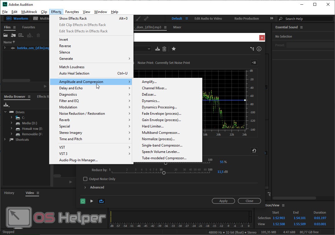Раз уж мы взялись за подавление шума в Adobe Audition, давайте приведем нашу аудиодорожку в надлежащий вид до конца. Для этого делаем несколько нехитрых шагов: