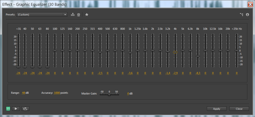 5 шаг. Эквалайзер. Ну тут я бы не назвала его обязательным. Но все же. Попробуем поэксперементировать конкретными частотами. Выбираем Effects — Filter and EQ — Graphic Equalizer (30 Bands). Появится диалоговое окно, в котором вы можете настраивать конкретные частоты, пользуясь рекомендациями из прошлого урока «Качественная обработка голоса в Adobe Audition» или чисто интуитивно, каждый раз прослушивая результат изменений, как я и сделала: