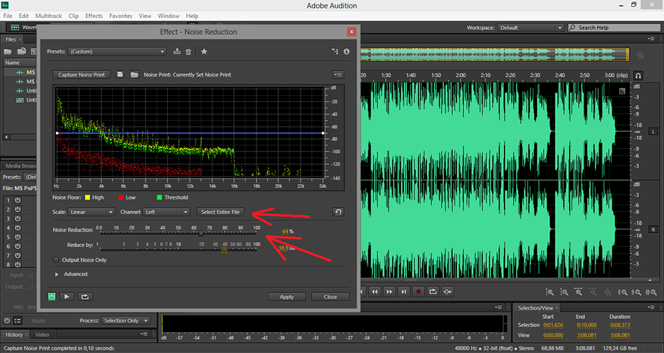 Если вы хотите работать над шумами во всех записи, нажмите Select Entire File (Выбрать весь файл). Затем нужно настроить эффективность шумоподавления, для чего поиграйте с ползунками. Не стоит выкручивать уровень на 100%, потому что потеряется часть записи и звук станет искаженным. После того, как вы задали настройки, нажимайте Apply и радуйтесь результату.