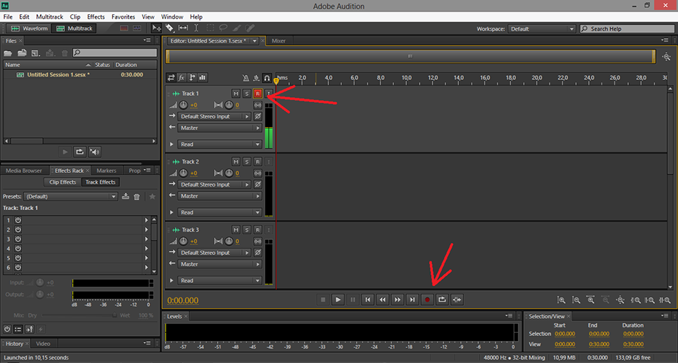 После этого вы увидите дорожки, на которые и будет писаться звук. Чтобы выбрать дорожку, нажмите R, ну а чтобы начать саму запись, нажмите красную кнопку, расположенную снизу