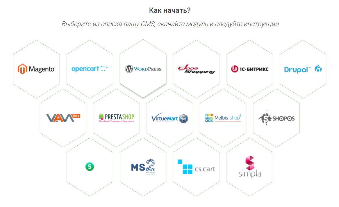 - 20+ плагинов к популярным CMS: Magento, WP, OpenCart; Drupal, Simpla и др.