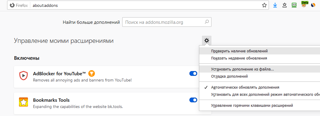 Далее, чтобы установить дополнение, пройдите на страницу about:addons (Меню Firefox => Дополнения или комбинация клавиш Ctrl+Chift+A) и нажмите на шестерёнку в правом верхнем углу страницы. Затем кликните пункт «Установить дополнение из файла» и выберите только что скачанный файл дополнения.