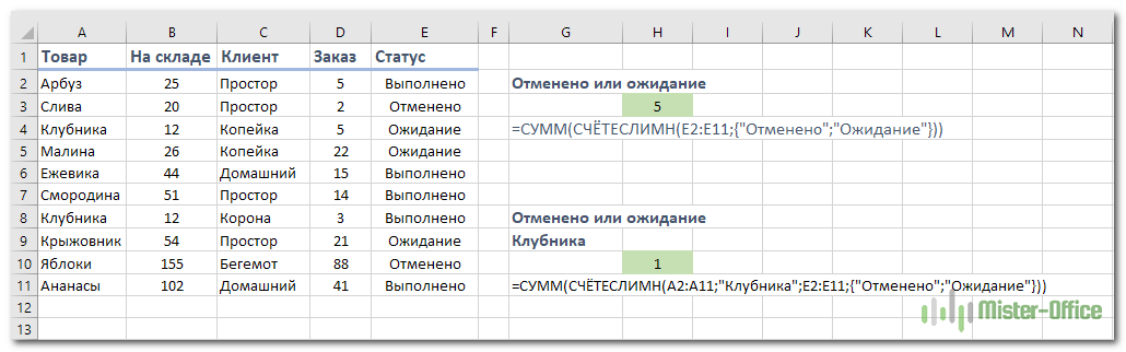 =СУММ(СЧЁТЕСЛИМН(E2:E11;{«Отменено»;»Ожидание»}))