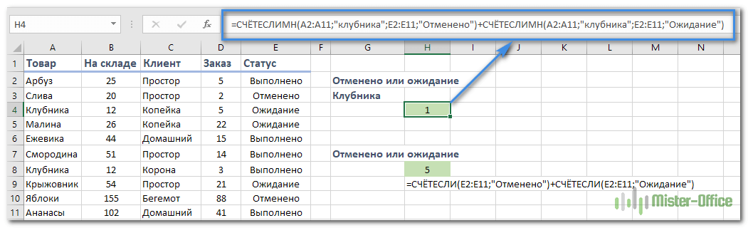 Аналогичным образом вы можете использовать две или более пары диапазон/условие. Чтобы вычислить количество заказов на клубнику, которые отменены или в стадии ожидания, используйте это выражение:
