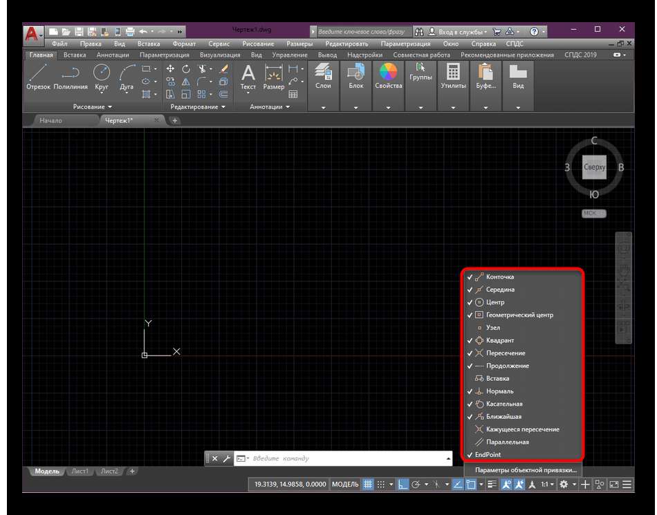 Для начала требуется активировать типы привязок. Существует ряд характеристик, которые употребляются в большинстве случаев, конкретно от этого следует исходить, но не запамятовывайте и о личных предпочтениях. Иногда юзеры сталкиваются с необходимостью строения объекта со специфичными привязками. Потому мы только покажем способ активации сопоставлений, а вы выберете те, которые необходимы конкретно вам.