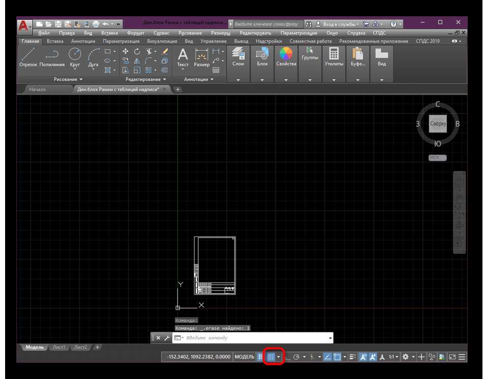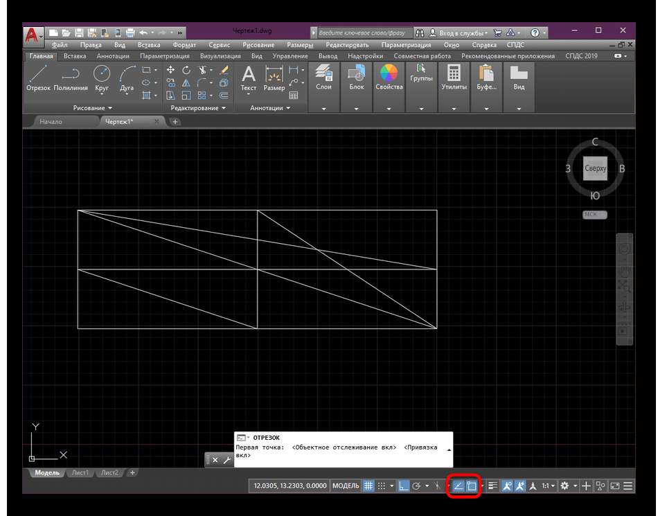 - Понизу на статусной строке нажмите на подобающую кнопку под заглавием «Привязка к сетке чертежа». Если она отмечена голубым цветом, это значит успешное включение.