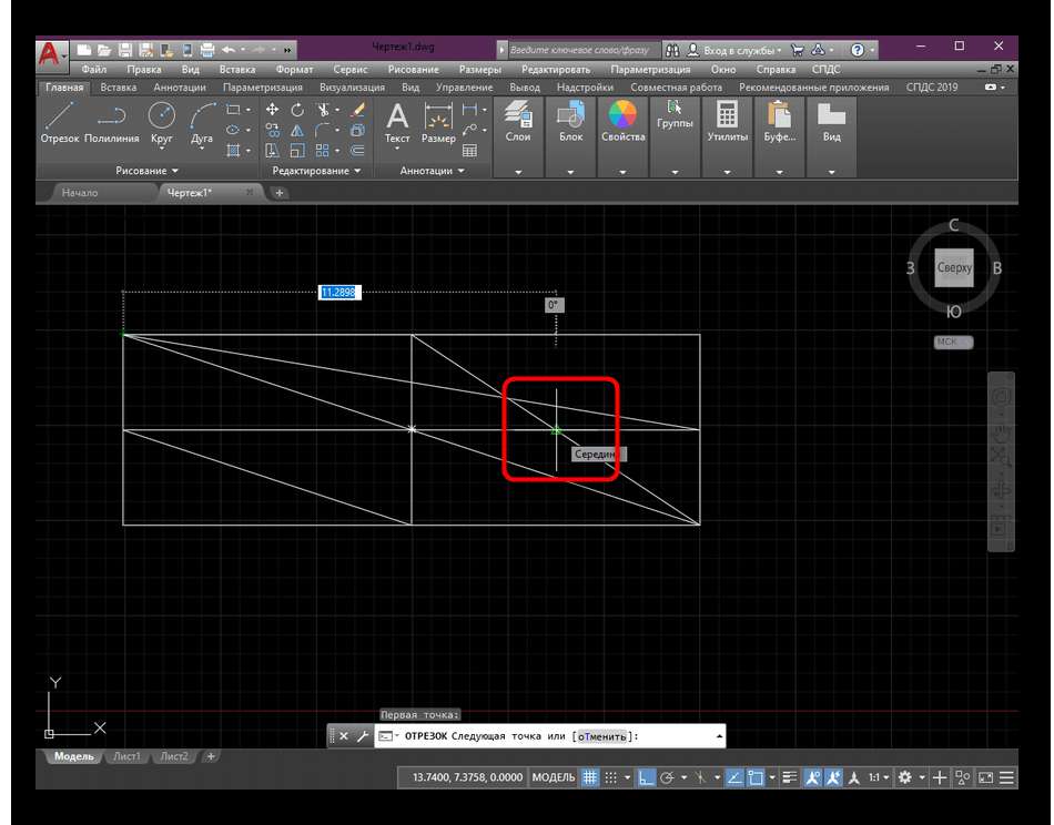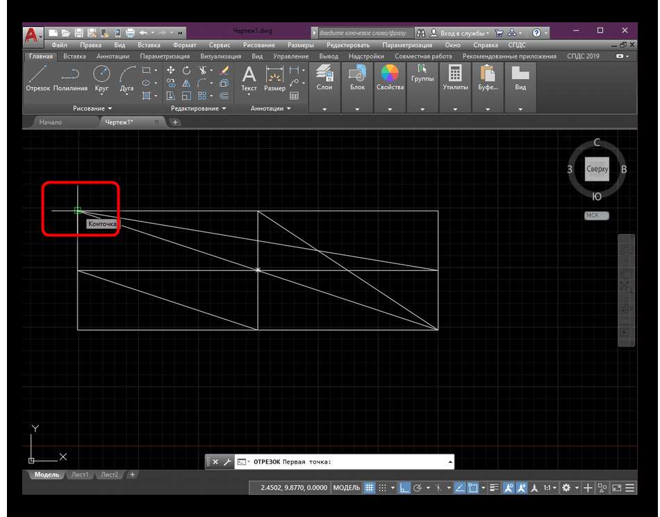 Чтобы подобные построения можно было выполнять с помощью мыши, в системе AutoCAD предусмотрен режим «объектной привязки». Когда мы начнем строить отрезок и подведем курсор к углу прямоугольника, то курсор автоматически «притянется» к нужной точке.