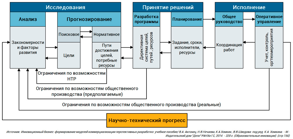 Научно-технический прогресс (НТП) складывается действиями всей совокупности субъектов, принимающих участие в его реализации, но движителями выступают хозяйствующие субъекты независимо от формы собственности. И отдельно взятая компания, являясь элементом системы НТП, выполняет разработку прогнозов, которые входят в исследовательскую стадию, предшествующую программной проработке инноваций и их планированию. Качество и обоснованность стратегий фирмы напрямую связаны с уровнем долгосрочного и среднесрочного прогнозирования. Ниже вашему вниманию предлагается схема управления НТП, разбитого на три этапа.