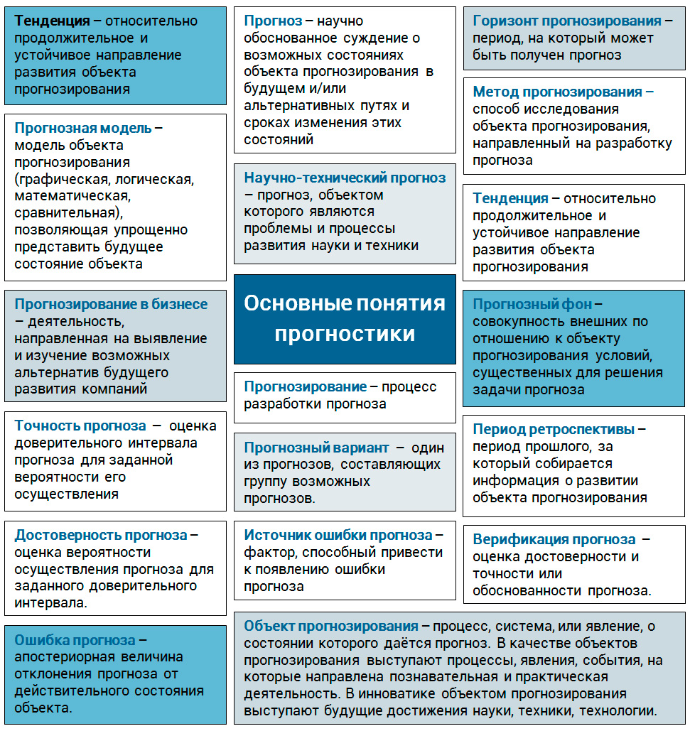 Надо понимать, что опережающая информация и само прогнозирование носят характер вероятностного развития событий. В силу случайности, стохастичности исследуемых процессов ориентирующая ЛПР информация не может гарантировать полную достоверность и служить безупречной основой для принятия решений. Прогнозы работают, если обеспечен непрерывный процесс исследований, мониторинга, анализа ретроспективы, краткосрочных, среднесрочных и долгосрочных наблюдений и предположений. Ниже на схеме представлен перечень основных понятий и их кратких определений прогностики.