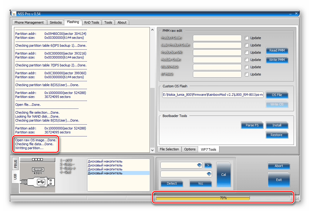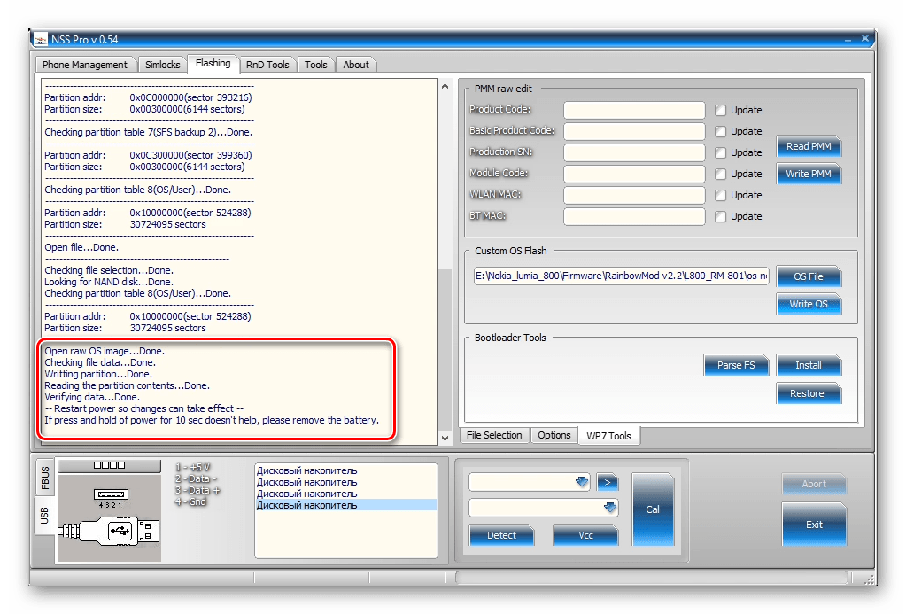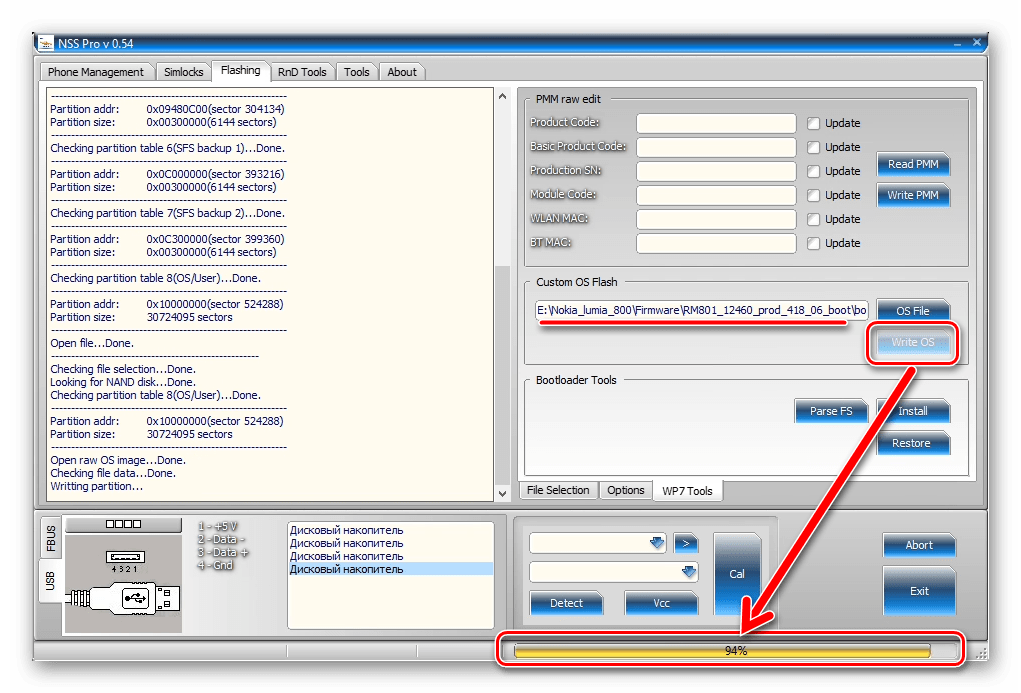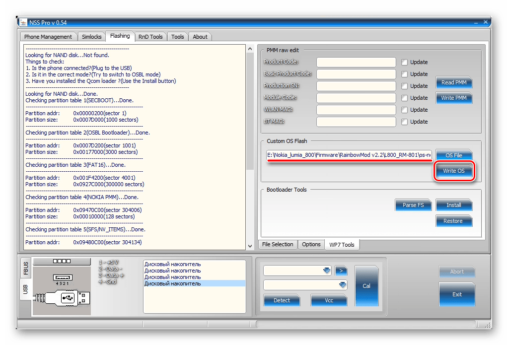 После того как файл с ОС добавлен в программу, начинаем операцию по переносу образа в память Lumia 800 нажатием «Write OS»