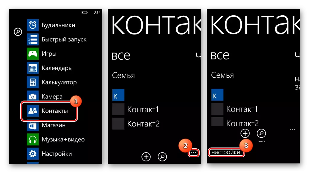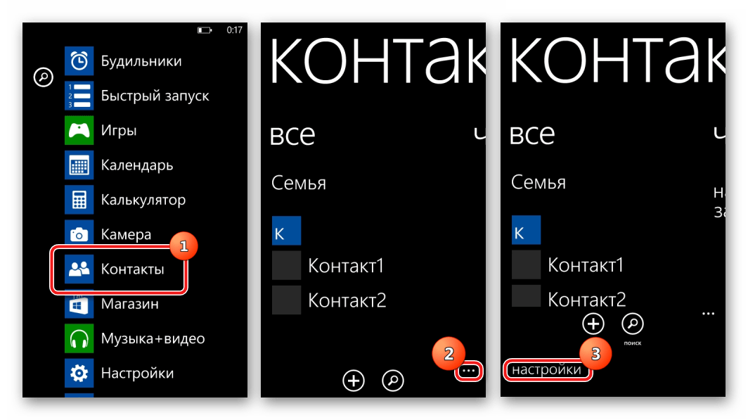 - Run the «Contacts» application on the phone and go to «Settings» by clicking on the image of three points at the bottom of the screen.