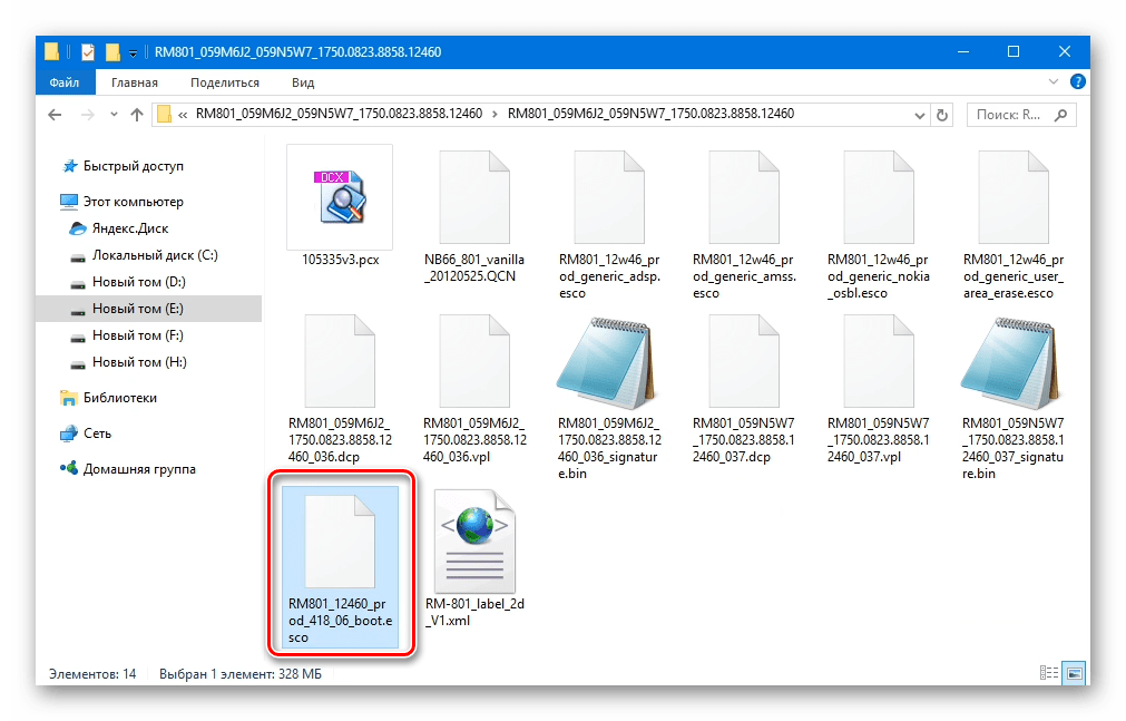 - Распаковываем пакет с официальной прошивкой и находим в каталоге, содержащем компоненты, файл RM801_12460_prod_418_06_boot.esco