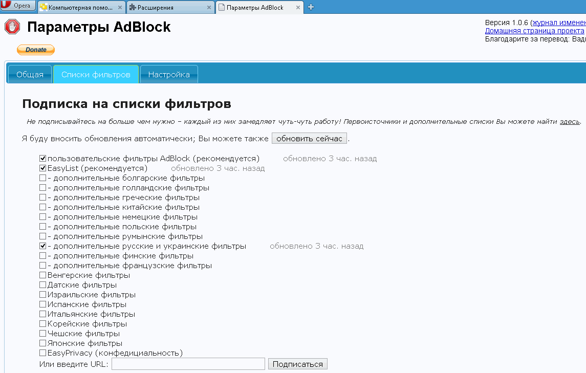 Там же есть информация о времени обновления фильтров. С помощью этих самых фильтром и происходит блокировка рекламы в Опере.
