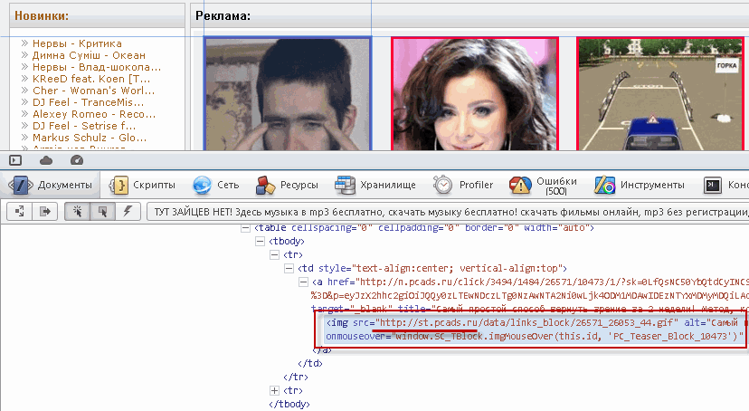 В низу страницы откроется окошко с исходным кодом страницы. Нажмите левой кнопкой мышки на рекламу и в нижней части окна увидите элемент отвечающий за ее отображение