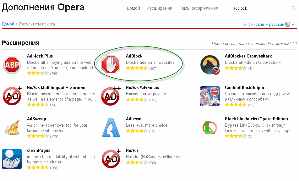 Из результатов поиска выбираете AdBlock. Можно и другие попробовать, но рекоммендуемый — это проверенно и надежно. Не советую устанавливать несколько расширений для блокировки рекламы в браузере Опера, так как каждый плагин нагружает компьютер и увеличивает время загрузки страниц. Другими словами ваш любимый браузер может начать тормозить. (Если ваш любимый браузер Google Chrome и он медленно начал работать попробуйте ускорить его прочитав статью Что делать если Google Chrome тормозит?)