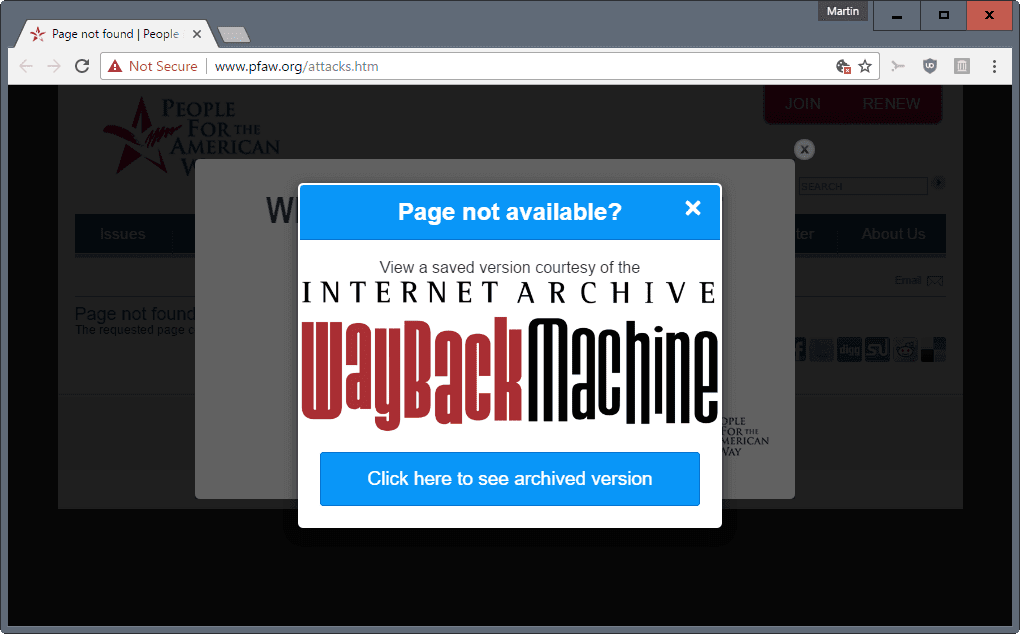 Wayback Machine — это расширение Chrome, которое дает вам возможность открывать архивную копию веб-страницы, если исходная страница временно или постоянно недоступна.